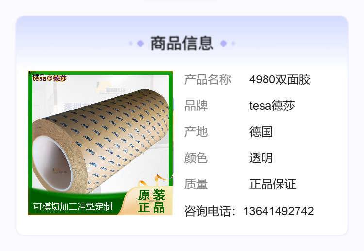 即刻啟用,讓粘接成為確定性優(yōu)勢tesa德莎4980雙面膠帶已廣泛應(yīng)用于華為、比亞迪、立訊精密、歌爾股份等企業(yè)的二級(jí)供應(yīng)商體系。無論您需要小批量驗(yàn)證樣品、中試階段分切料盤,還是量產(chǎn)級(jí)模切套件,深圳市楷銘科技有限公司均支持靈活起訂與快速響應(yīng)。請明確您的基材類型(金屬/塑料/陶瓷)、貼合溫度窗口、剝離強(qiáng)度要求及外形公差,我們將基于tesa德莎原廠技術(shù)手冊,為您匹配最優(yōu)規(guī)格與加工方案。在粘接這件事上,真正的專業(yè)主義,是讓每一次剝離都符合預(yù)期,讓每一處粘接都成為產(chǎn)品可靠性的無聲注腳。